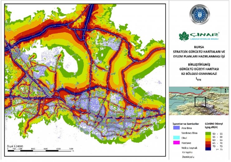 Bursa'nın sağlıklı ve yaşanabilir bir kent olması hedefiyle çalışmalarını aralıksız sürdüren Büyükşehir Belediyesi, kentin stratejik gürültü haritasının oluşturulmasının ardından eylem planı çalışmalarını da hız kesmeden sürdürüyor. Özellikle hastane, okul, konut gibi hassas alanları etkileyen ve 3 milyon 147 bin 818 kişinin gürültüye maruziyetinin değerlendirildiği Stratejik Gürültü Haritaları, Çevre, Şehircilik ve İklim Değişikliği Bakanlığı tarafından daha önce onaylanmıştı. Haritalar, 550 kilometre karayolu, 47.2 kilometre mevcut, 11.7 kilometre planlanan demiryolu, 300 adet eğlence yeri ile 7 adet sanayi bölgesi ve ayrıca 10 adet sanayi tesisini kapsayan bölgede gürültü ölçümü ve araç sayımları yapılarak hazırlanmıştı. Projenin ikinci ayağını oluşturan eylem planı çerçevesinde, şimdi de Çevresel Gürültü ve Haritalama Eylem Planı Çalıştayı düzenlendi. Bursa Büyükşehir Belediye Başkanı Alinur Aktaş'ın yanı sıra Çevre, Şehircilik ve İklim Değişikliği Bakanlığı Modelleme ve Haritalama Şube Müdürü Nuray Hüsmen'in de katıldığı çalıştayda, bundan sonra izlenecek yol haritası, konunun tüm taraflarınca masaya yatırıldı.