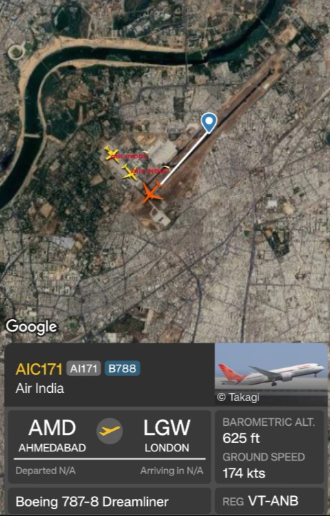 Hindistan'ın Ahmedabad kentinde Hindistan Havayolları'na ait Boeing 787 Dreamliner modeli AIC171 sefer sayılı yolcu uçağı düştü. Hindistan basınında yer alan haberlere göre, İngiltere'nin Birmingham kentine sefer gerçekleştiren uçakta 242 kişi bulunuyor. Uçağının son sinyalinin yerel saatle 08:08:51'de, 625 feet yükseklikteyken, kalkıştan sadece birkaç saniye sonra alındığı açıklandı.