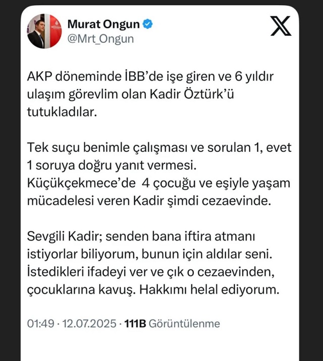 İBB soruşturmalarında tutuklanan Medya AŞ Yönetim Kurulu Başkanı Murat Ongun dün tutuklanan şoförüne seslendi. İBB soruşturmasında gözaltına alınan makam şoförleri de tutuklandı. Medya AŞ Yönetim Kurulu Başkanı Murat Ongun şoförüne, "Kadir; senden bana iftira atmanı istiyorlar biliyorum, bunun için aldılar seni. İstedikleri ifadeyi ver ve çık o cezaevinden, çocuklarına kavuş. Hakkımı helal ediyorum." ifadelerini kullandı Ongun, "AKP döneminde İBB’de işe giren ve 6 yıldır ulaşım görevlim olan Kadir Öztürk’ü tutukladılar" dedi.