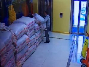 Güvenlik kameralarına yansıyan görüntülerde, iki şüpheli asansörle üçüncü kata çıkıyor. Biri etrafı kolaçan ederken diğeri asansörün kapısını açık tutuyor. Etrafta kimsenin olmadığı anda 250 adet tişörtün bulunduğu çuvalı alıp asansörün içine atıyorlar. Asansörle zemin kata inerek olay yerinden uzaklaşıyorlar.