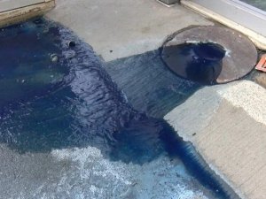 İstanbul Sultangazi'de rögardan taşan mavi renkli suya, bir tekstil firmasının yıkama işlemi için kullandığı ponza taşının neden olduğu ortaya çıktı.