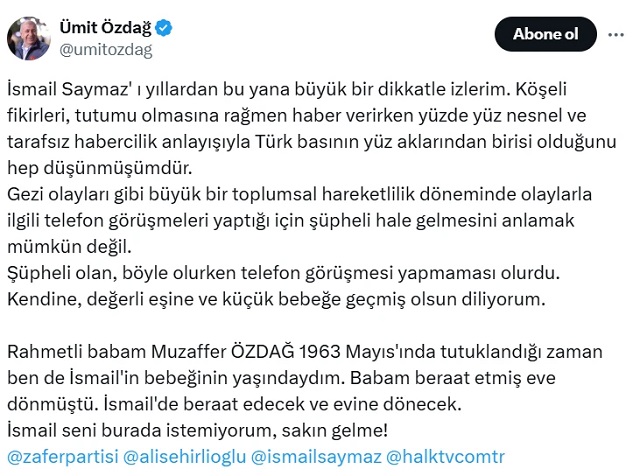 "İsmail Saymaz'ı yıllardan bu yana büyük bir dikkatle izlerim. Köşeli fikirleri, tutumu olmasına rağmen haber verirken yüzde yüz nesnel ve tarafsız habercilik anlayışıyla Türk basının yüz aklarından birisi olduğunu hep düşünmüşümdür. Gezi olayları gibi büyük bir toplumsal hareketlilik döneminde olaylarla ilgili telefon görüşmeleri yaptığı için şüpheli hale gelmesini anlamak mümkün değil. Şüpheli olan, böyle olurken telefon görüşmesi yapmaması olurdu.