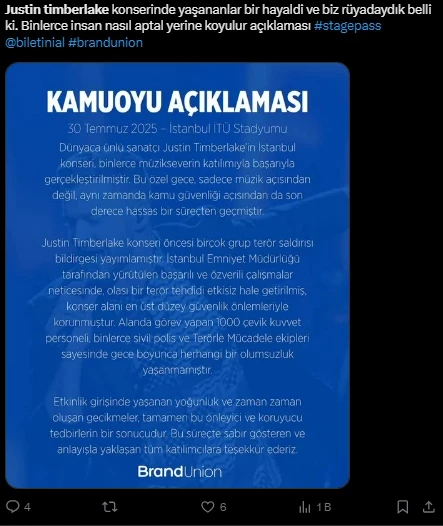 Dünyaca ünlü pop yıldızı Justin Timberlake’in 11 yıl aradan sonra İstanbul’da verdiği konser büyük bir organizasyon skandalına sahne oldu. 30 Temmuz akşamı İstanbul Teknik Üniversitesi (İTÜ) Stadyumu’nda gerçekleşen konsere saatler öncesinden gelen binlerce hayran, uzun kuyruklar ve karmaşa nedeniyle içeriye giremedi. Biletli izleyiciler saatlerce giriş kapılarında bekletildi. Güvenlik ve organizasyon eksikliği nedeniyle kalabalık kontrol altına alınamayınca, iddiaya göre kapılar bir noktada tamamen açılarak rastgele girişlere izin verildi. Bu durum, biletli izleyicilerin büyük tepkisine neden oldu. Sosyal medyada tepkiler çığ gibi büyürken, birçok kişi konseri "belediye etkinliği gibi" olarak nitelendirdi. Konser alanında güvenlik zafiyetleri dikkat çekerken, sahne önüne geçişlerde de büyük karışıklık yaşandı. Organizasyon firmasına yönelik tepkiler artarken, henüz resmi bir açıklama yapılmadı.