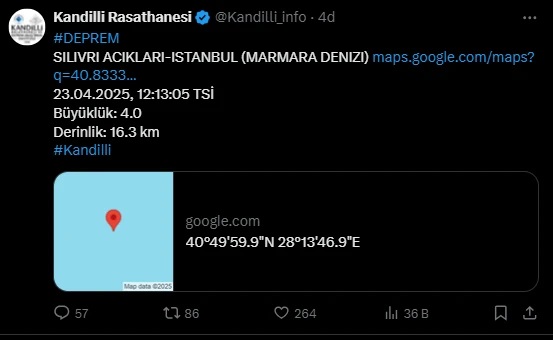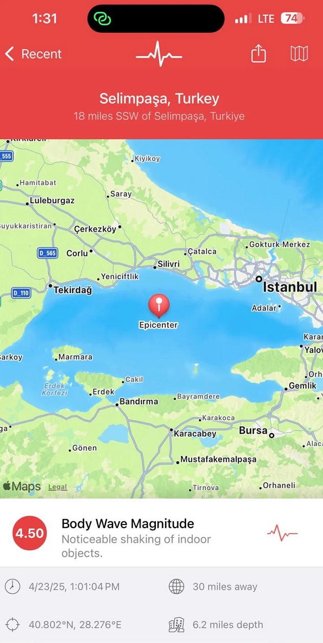 EMSC'nin uygulamasına göre Selimpaşa merkezli 4. 5 büyüklüğünde bir deprem daha meydana geldi.