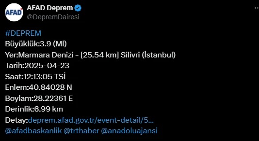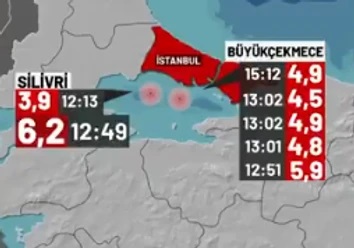 İstanbul'da 6,2, 5.9, 4.9 ve 4.8 büyüklüğünde peş peşe depremler meydana geldi. 6,2'lik depremin saat 14:49'da Silivri açıklarında; 5.9'luk depremin 12:51'de, 4.8'lik 13:01'de ve 4.9'luk depremin 13:02'de Büyükçekmece merkezli olduğu öğrenildi. Silivri’de bazı binalarda hasar meydana geldiği belirtirken hasar tespiti için belediye ekipleri yönlenrildi. Gençlik ve Spor Bakanı Osman Aşkın Bak, İstanbul'daki depremin ardından kentteki yurtlarda bir problem meydana gelmediğini duyurdu. İçişleri Bakanı Ali Yerlikaya, Çevre Şehircilik ve iklim Bakanı Murat Kurum ve Sağlık Bakanı Kemal Memişoğlu'nun da AFAD’daki çalışmaları takip etmek üzere İstanbul'a doğru yola çıktığı bildirildi. CHP İstanbul İl Başkanı Özgür Çelik, bugün yapılacak ulusal egemenlik yürüyüşünün iptal dildiğini duyurdu. Okulların yarın açık olacağını söyleyen Bakan Tekin, 'Okulların 2 gün tatil edildiğini' dedi.