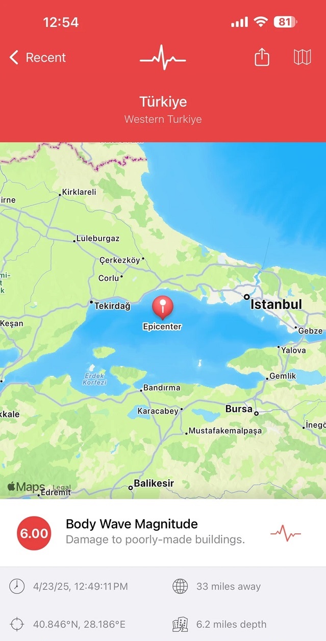 "Marmara Denizi içinde bugün saat 12.49’da 6.2 büyüklüğünde bir deprem meydana geldi. Yerin yaklaşık 7 km derinliğindeki deprem toplam 13 saniye sürdü. Silivri açıklarına 24 km uzaklıkta olan deprem başta İstanbul olmak üzere civar illerde de hissedildi. Saat 15.12’ye kadar en büyüğü 5.9 olan 51 artçı deprem kaydedildi. 112 Acil Çağrı Merkezimize şu ana kadar 6 bin 100 ihbar geldi. Bu ihbarların büyük çoğunluğu bilgi almaya yönelikti.
