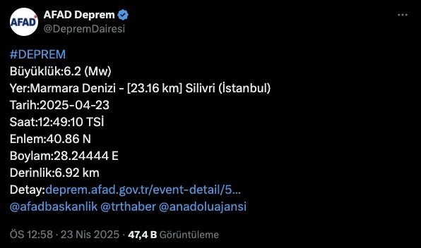 AFAD İstanbul'da meydana gelen depremin merkezini Silivri, büyüklüğünü 6.2 olarak açıkladı.