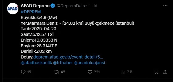 Saat 15.12'de Büyükçekmece merkezli 4.9 büyükliğü olan bir deprem daha oldu.