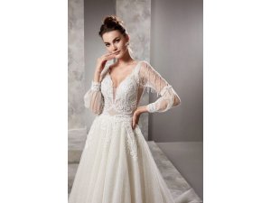 Karşınızda bulunduğu her yere zarafeti getiren bir model! Aslında bu modeli hem yalın hem de buna rağmen kendinden emin bir duruşu olduğu için seveceğinizi düşünüyoruz. Kol kısmının düşük olması ve ona eşlik aplike danteller çok romantik bir hava katıyor gelinliğe. Eğer salaş, yeşillikler içinde bir bahar düğünü yapacaksanız bu modeli kaçırmayın.