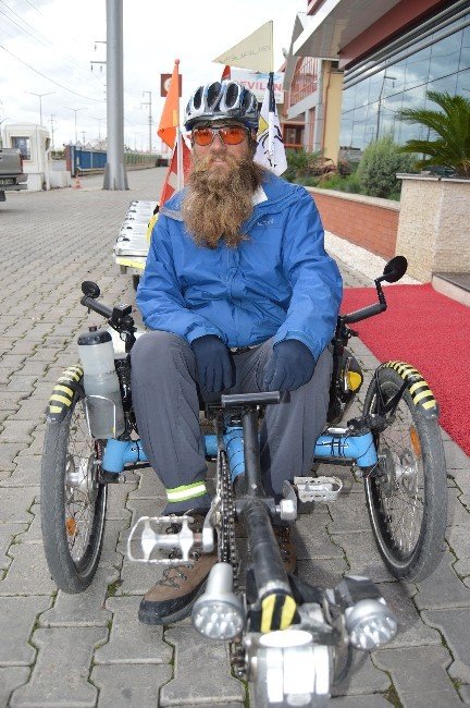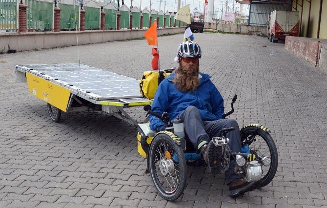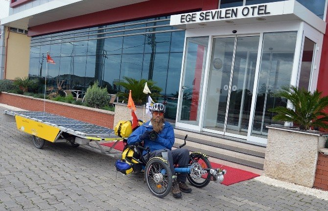 Güneş panellerinden oluşan römorku ve recumbent bisikleti ile dünya turuna çıkan İsviçreli David Brandenberger yolculukta oldukça dikkatli seyrettiğini ifade ederken en önemli konunun gece konaklamalarında bisikletinin güvenli bir yere park etmek olduğunu dile getirdi. Güneş panellerinden oluşan römorku ve recumbent bisikletin uzunluğu ise tam 5,3 metre. Sabah yola çıkmadan önce hummalı bir çalışma yapan ve bisikletini hazırlayan David Brandenberger hiç bir şeyi şansa bırakmıyor ve titiz bir çalışmayla kendini yola hazırlıyor. David Brandenberger;" 7 aydır yollardayım, dünya turuna çıktım. Normalde gözlükçülük yapıyorum, ancak dünyayı dolaşma fikri beni çok mutlu ediyor. Buradan Alaşehir'e gideceğim, yolculuğumu Çin'e kadar sürdürmek istiyorum" dedi. Otel personeliyle vedalaşan David Brandenberger bisikletinin pedallarını çevirmeye başladı ve yeni yerleri keşfetmek için yollara düştü.