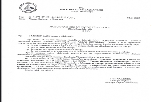 "Kartalkaya mevkii Bolu adresinde şirketiniz şahsınız tarafından açılmak istenilen 70m2 kapalı alan "Kafe restoran" faaliyet konulu iş yerinizin Müdürlüğümüz personeli tarafından yangın güvenliği yönünden yapılan incelemesi tamamlanmış olup; iş yeri içerisinde 1 adet 6 kg'lik KKT'li yangın söndürme cihazlarının mevcut olduğu, kaçak akım rölesinin mevcut olduğu, iş yerinde acil aydınlatmanın mevcut olduğu, işyeri içerisinde LPG türü parlayıcı ve patlayıcı madde bulundurulmaması gerektiği ayrıca yangına sebep olabilecek malzeme ve ısı kaynaklarının kullanımında dikkatli davranılması gerekmektedir."