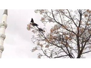Ankara'da ağaçta kediyle karganın gülümseten kavgası cep telefonu kamerasına yansıdı.