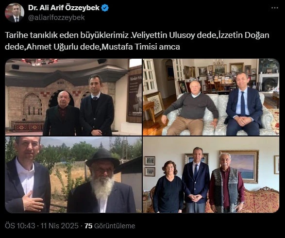 Alevi-Bektaşi Kültür ve Cemevi Başkanlığı Kurucu Başkanı Ali Arif Özzeybek geçtiğimiz gün Sosyal ve Gençlik Politikaları Kurulu üyeliğine atanmıştı. Özzeybek sosyal medya hesabından Alevi toplumunun önde gelen isimleri fotoğraflarını paylaştı. Özzeybek'in paylaşımında, Hacı Bektaş Veli Dergahı Postnişini Veliyettin Hürrem Ulusoy, Cem Vakfı Genel Başkanı ve hukukçu Prof. Dr. İzzettin Doğan, Alevi Dedesi Ahmet Uğurlu ve eski Sivas Milletvekili Mustafa Timisi bulunuyor. Özzeybek paylaşımına şu notunu düştü, "Tarihe tanıklık eden büyüklerimiz .Veliyettin Ulusoy dede, İzzetin Doğan dede, Ahmet Uğurlu dede, Mustafa Timisi amca"