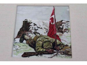 Resmin orijinal renklerini kullanarak 3 boyutlu olarak işlediklerini ifade eden El Nakışları Öğretmeni Emine Karaarslan, "Biz öncelikle Mehmetçik'i kumaşa tamamen birebir şekilde resmetmeye çalıştık. Tamamen saf ve doğal olan 100 farklı renk tonunda ipek iplikler kullandık. Günde 8 saatlik bir çalışmayla 4 aylık bir süre içerisinde çalışmayı bitirdik. 100 farklı renk tonundan ipliklerin hepsini yarım kat şeklinde resim tekniği uygulayarak, resmin aslını 3 boyutlu bir şekilde ve aynı renk tonlarını kullanarak yaptık. Bizim için çok zor oldu. İpliğin bir katı kalın geldiği için ikiye ayırıp yarım kat olarak kullandık. Bu da işleme süresini uzattı ancak sonunda çok güzel bir çalışma çıktı" dedi.