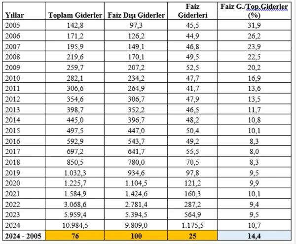 "Öteden beri faiz giderlerinin devletin bütçesinde ve nakit dengesinde büyük yer tuttuğu, faiz giderlerinin düşürülmesi halinde sorunların önemli ölçüde çözüleceği öne sürülür ve genellikle de bu görüş doğru kabul edilir. Hazine ve Maliye Bakanlığı ve TÜİK verilerinden yararlanarak hazırladığım aşağıdaki tablo 2005 yılından bu yana devletin toplam nakit giderlerini, bu toplam içinde faiz dışı giderler ile faiz giderlerinin paylarını milyar TL olarak ilk üç sütunda, faiz giderlerinin toplam giderler içindeki payını da yüzde olarak son sütunda sergiliyor.