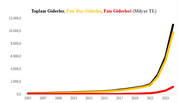 Amacımız faize güzelleme yapmak değil. Faiz giderleri düşürülmelidir ama grafiğe bakınca faiz giderlerinin oransal olarak faiz dışı giderlere göre fazla yüksek olmadığını görüyoruz. Buna karşın toplumun çoğunluğu, bütün sorunların kökeninde faiz giderlerinin yattığı inancını taşımaya devam ediyor. Bu algının yaygınlaşması önemli ölçüde siyasetçilerin bu yöndeki açıklamalarından kaynaklanıyor. Faiz, bu toplumda en kolay lanetlenebilen kalemdir. Dikkatlerin faiz giderleri üzerinde toplanmasıyla kamu giderlerinin başka alanlarındaki aşırılıklar gözden uzak tutulmuş oluyor. Faiz karşıtlığı yaygın bir nefret odağı oluşturduğu için bu tür bir ortak lanetleme faiz dışı giderlerin rahatlıkla artırılmasına olanak sağlıyor. Toplum, faizi lanetlerken, kamu kesiminin diğer alanlarda yarattığı büyük israfı ve faiz giderlerinin artmasındaki asıl nedenin bu diğer giderlerdeki artış olduğu gerçeğini gözden kaçırıyor".