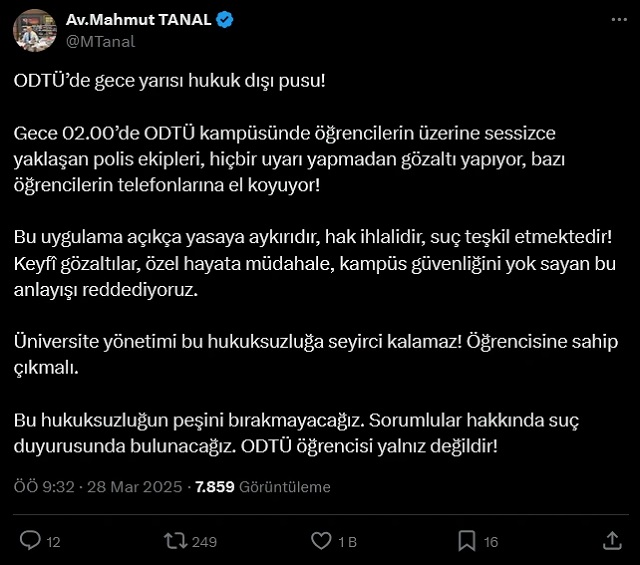 ODTÜ öğrencileri ziyareti sırasında Tanal'a el örgüsü ile yapılmış TOMA hediye ettiler. Polisin, CHP vekillerinin ayrılmasının ardından gözaltılara başlandığı belirtildi. CHP Şanlıurfa Milletvekili Mahmut Tanal, gözaltılara ilişkin sosyal medya hesabından yaptığı açıklmada şu ifadeleri kullandı: