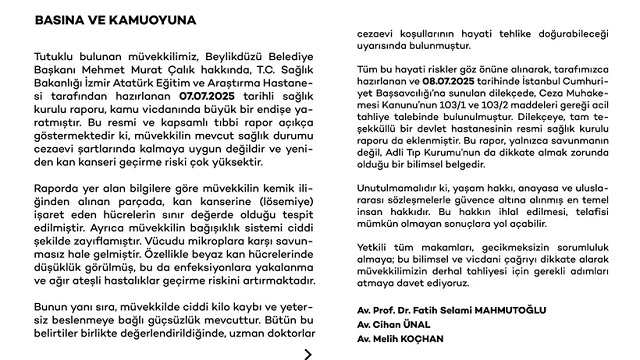Tutuklu bulunan müvekkilimiz, Beylikdüzü Belediye Başkanı Mehmet Murat Çalık hakkında, T.C. Sağlık Bakanlığı İzmir Atatürk Eğitim ve Araştırma Hastanesi tarafından hazırlanan 7 Temmuz 2025 tarihli sağlık kurulu raporu, kamu vicdanında büyük bir endişe yaratmıştır. Bu resmi ve kapsamlı tıbbi rapor açıkça göstermektedir ki, müvekkilin mevcut sağlık durumu cezaevi şartlarında kalmaya uygun değildir ve yeni-den kan kanseri geçirme riski çok yüksektir. Raporda yer alan bilgilere göre müvekkilin kemik iliğinden alınan parçada, kan kanserine (lösemiye) işaret eden hücrelerin sınır değerde olduğu tespit edilmiştir. Ayrıca müvekkilin bağışıklık sistemi ciddi şekilde zayıflamıştır. Vücudu mikroplara karşı savun-masız hale gelmiştir. Özellikle beyaz kan hücrelerinde düşüklük görülmüş, bu da enfeksiyonlara yakalanma ve ağır ateşli hastalıklar geçirme riskini artırmaktadır. Bunun yanı sıra, müvekkilde ciddi kilo kaybı ve yetersiz beslenmeye bağlı güçsüzlük mevcuttur. Bütün bu belirtiler birlikte değerlendirildiğinde, uzman doktorlar cezaevi koşullarının hayati tehlike doğurabileceği uyarısında bulunmuştur. Tüm bu hayati riskler göz önüne alınarak, tarafımızca hazırlanan ve 8 Temmuz 2025 tarihinde İstanbul Cumhuriyet Başsavcılığı'na sunulan dilekçede, Ceza Muhakemesi Kanunu'nun 103/1 ve 103/2 maddeleri gereği acil tahliye talebinde bulunulmuştur. Dilekçeye, tam teşekküllü bir devlet hastanesinin resmi sağlık kurulu raporu da eklenmiştir. Bu rapor, yalnızca savunmanın değil, Adli Tıp Kurumu'nun da dikkate almak zorunda olduğu bir bilimsel belgedir. Unutulmamalıdır ki, yaşam hakkı, anayasa ve uluslararası sözleşmelerle güvence altına alınmış en temel insan hakkıdır. Bu hakkın ihlal edilmesi, telafisi mümkün olmayan sonuçlara yol açabilir. Yetkili tüm makamları, gecikmeksizin sorumluluk almaya; bu bilimsel ve vicdani çağrıyı dikkate alarak müvekkilimizin derhal tahliyesi için gerekli adımları atmaya davet ediyoruz.