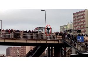 Şirinevler Metrobüs Durağı'nda dün akşam saatlerinde yaşanan yoğunluk vatandaşlara zor anlar yaşattı. Metrobüse binmeye çalışan yolcular üst geçide kadar uzun kuyruklar oluşturdu. Vatandaşlar yürümekte güçlük çekerken, bir vatandaş ise kalabalığı geçmek için üst geçidin demir korkulukları üzerinde yürüyerek, hayatını tehlikeye attı. Adeta bir cambaz gibi korkuluklar üzerinde yürüyen vatandaş, görenleri hayrete düşürdü. O anlar cep telefonu kamerası tarafından kaydedilirken, üst geçit üzerinde oluşan görüntü yürekleri ağızlara getirdi.