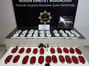 İl Emniyet Müdürlüğünden yapılan açıklamaya göre, Narkotik Suçlarla Mücadele Şube Müdürlüğü ekipleri, il genelinde uyuşturucu madde ticareti yapan şahısların suç unsurları ile birlikte yakalanmasına yönelik yaptıkları çalışmalar çerçevesinde, merkez Akdeniz ilçesinde bulunan bir ikamette narkotik madde arama köpeği "Miror" ile yapılan aramada, 41 paket halinde 7 kilo 950 gram gelen takoz esrar ele geçirildi.