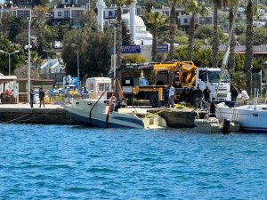 Muğla'nın Bodrum ilçesinde dün etkili olan fırtınada batan bir motoryat, vinç yardımıyla kurtarıldı.