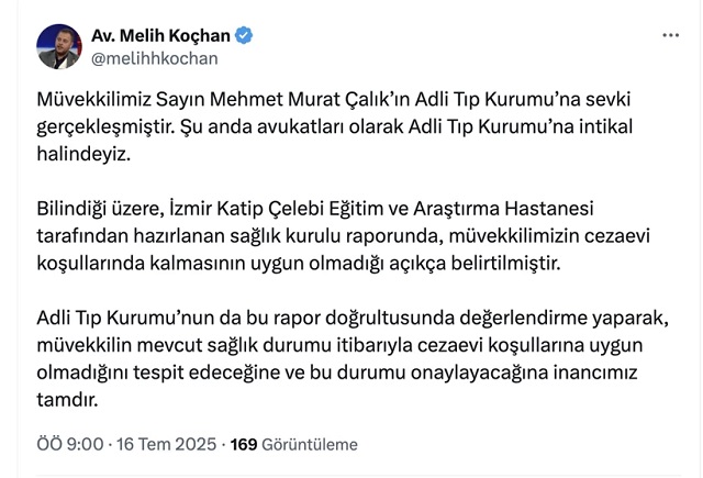 "Müvekkilimiz Sayın Mehmet Murat Çalık’ın Adli Tıp Kurumu’na sevki gerçekleşmiştir. Şu anda avukatları olarak Adli Tıp Kurumu’na intikal halindeyiz. Bilindiği üzere, İzmir Katip Çelebi Eğitim ve Araştırma Hastanesi tarafından hazırlanan sağlık kurulu raporunda, müvekkilimizin cezaevi koşullarında kalmasının uygun olmadığı açıkça belirtilmiştir. Adli Tıp Kurumu’nun da bu rapor doğrultusunda değerlendirme yaparak, müvekkilin mevcut sağlık durumu itibarıyla cezaevi koşullarına uygun olmadığını tespit edeceğine ve bu durumu onaylayacağına inancımız tamdır".