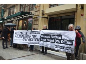 Beyoğlu Kent Savunması üyeleri, Beyoğlu İstiklal Caddesi'nin en eski binalarından Narmanlı Han'da yürütülen restorasyon projesini, tarihi ve kültürel değerlere zarar verdiği gerekçesiyle protesto etti.