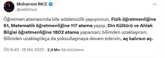Aynı zamanda fizik öğretmeni de olan Muharrem İnce, sosyal medya hesabından yaptığı paylaşımda, "Öğretmen atamasında bile adaletsizlik yapıyorsun. Fizik öğretmenliğine 61, Matematik öğretmenliğine 117 atama yapıp, Din Kültürü ve Ahlak Bilgisi öğretmenliğine 1802 atama yaparsan; bilimden uzaklaşırsın. Bilimden uzaklaştıkça da yoksullaşmaya devam edersin, aç kalırsın aç." ifadelerini kullanmıştı.