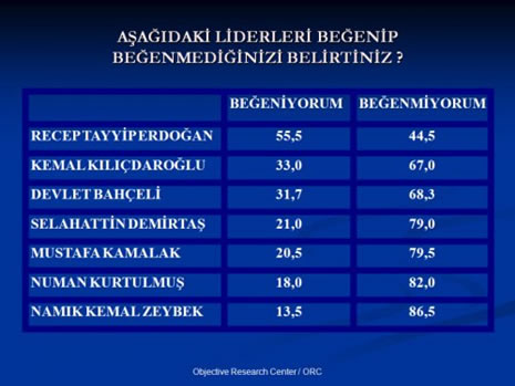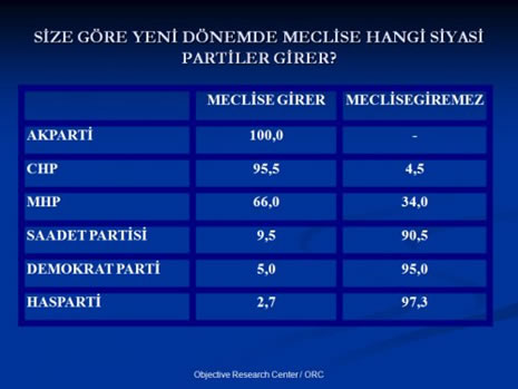 Objective Research Center, (ORC) “Türkiye Siyaset Gündemi-Nisan 2011” başlıklı anket çalışması için, 13-16 Nisan tarihleri arasında 41 ilin hem kentsel, hem de kırsal kesimlerinde, seçmen nüfusunu temsil etme yeteneğine sahip 18 yaş üstü yüzde 55.5’i erkek, yüzde 45.5’i kadın toplam 4 bin 130 kişiyle yüz yüze görüştü.