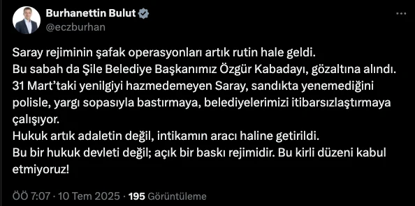 "Saray rejiminin şafak operasyonları artık rutin hale geldi. Bu sabah da Şile Belediye Başkanımız Özgür Kabadayı, gözaltına alındı. 31 Mart’taki yenilgiyi hazmedemeyen Saray, sandıkta yenemediğini polisle, yargı sopasıyla bastırmaya, belediyelerimizi itibarsızlaştırmaya çalışıyor. Hukuk artık adaletin değil, intikamın aracı haline getirildi. Bu bir hukuk devleti değil; açık bir baskı rejimidir. Bu kirli düzeni kabul etmiyoruz!".