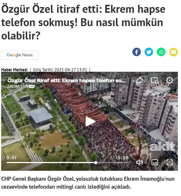 Özel'in, "Küçücük televizyonundan..." diyecekken "Küçücük telefonundan koca yüreğiyle izleyen Cumhurbaşkanı adayımız Ekrem İmamoğlu'dur" demesi gündem oldu. Özel'in sosyal medyada espri konusu olan sözlerinin 'İtiraf' olduğunu öne süren Yeni Akit ise haberi "Özgür Özel itiraf etti: Ekrem hapse telefon sokmuş! Bu nasıl mümkün olabilir?" başlığı ile verdi.