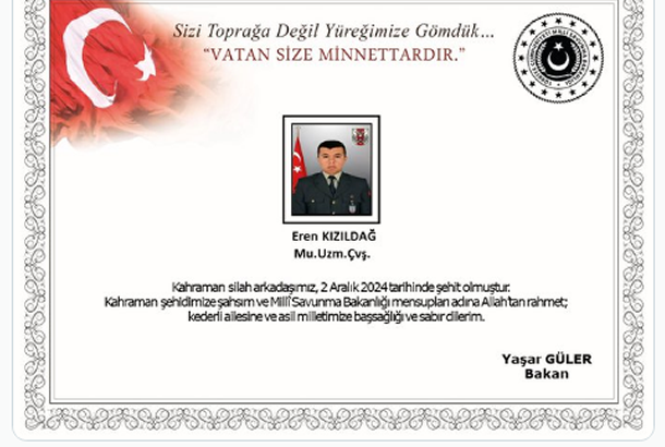 "Kahraman silah arkadaşımız 2 Aralık 2024 tarihinde şehit olmuştur. Kahraman şehidimize şahsım ve Milli Savunma Bakanlığı mensupları adına Allah'tan rahmet, kederli ailesine ve asil milletimize başsağlığı ve sabır dilerim."