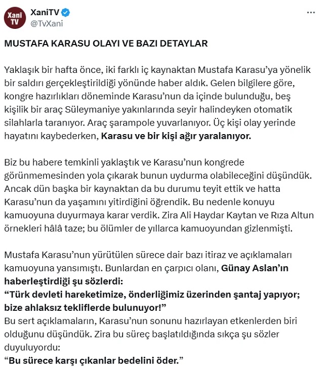 Milli çözüm sürecine yönelik eleştirel görüşlerini, terör örgütü PKK'ya yakın medya kuruluşlarında dile getiren PKK'nın sözde çatı oluşumu KCK elebaşlarından Mustafa Karasu'nun, PKK'nın fesih toplantısına katılmaması "örgüt içi infaza kurban gittiği" tartışmalarını başlattı. Son günlerde, PKK'nın sözde üst düzey yöneticilerinden Mustafa Karasu'nun örgüt içi infaz sonucu öldüğü iddiaları dile getiriliyor. Bu iddialar, Karasu'nun "fesih toplantısı" öncesinde örgüt içinde hedef alındığına dair yerel kaynaklara ve sosyal medya paylaşımlarına dayandırılıyor. Ancak, şu ana kadar bu iddiaları doğrulayan resmi bir açıklama veya bağımsız bir teyit bulunmuyor.
