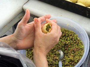 Mersin'de uzun yıllardır kerebiç üretimi ve satışını yapan "Kerebiççi Oğuz', Ramazan ayında üretimi 2 kat artırdı. Her gün 20 kadın sabahın erken saatlerinde başladıkları kerebiç yapma işlemini, akşama kadar sürdürüyor. Kerebiçin yanında mamul üretimi de yapan kadınlar, günde binlerce kerebiç yapıyorlar. Üretimi yapan 20 kadından biri olan ve 10 yıldır kerebiç işini yapan Sabahat Güçlü, Ramazan ayı dolayısıyla çalışmalarının 2 katına çıktığını söyledi. Kerebiçin Ramazan'a özgü çok lezzetli ve faydalı bir tatlı olduğunu kaydeden Güçlü, "Kerebiç su, irmik ve yağın karışımıyla oluşur. İçli köfte şekline getirilerek yapılan kerebiçin içine fıstık veya ceviz koyarak tavalara diziyoruz. Daha sonra odun ateşinde bir saat pişirdikten sonra özel kaymağımızla servis yapıyoruz. Günde ortalama 60-70 tepsi üretim yapıyoruz" dedi.