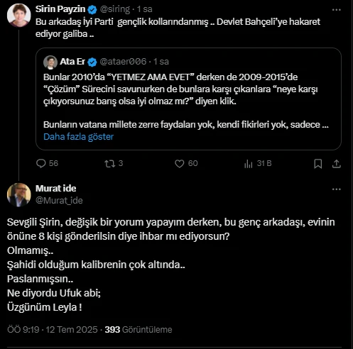 X platformunda, terör örgütü PKK'nın silah bırakmasının ardından başlayan tartışmalar, Şirin Payzın ve Murat İde arasında sert bir polemiğe dönüştü. Polemiğin merkezinde, İYİ Parti Gençlik Kolları'ndan bir kullanıcının Payzın'ın tweetini eleştirmesi ardından patlak verdi. Payzın paylaşımına gelen yoruma yönelik verdiği yanıt İde'den tepki gördü.