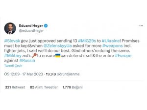 Slovakya Başbakanı Eduard Heger, Ukrayna'ya Sovyet yapımı 13 adet MiG-29 savaş uçağı göndereceklerini duyurdu.