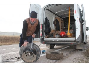 Bayburt'ta mobil aracıyla yolda araçlarının lastiği patlayanların yardımına yetişen ve kentte ismi "Süpermen" lastikçiye çıkan vatandaş, ekmeğini bu şekilde kazanıyor.