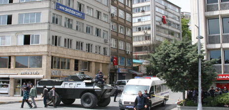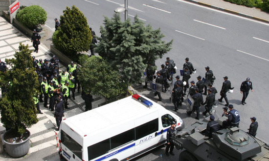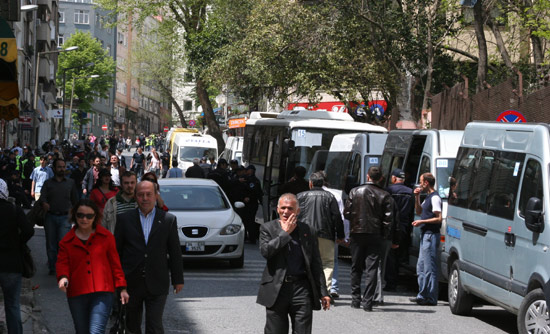 Taksim’e çıkan Kazancı yokuşu polis kuşatmasına alındı. Çıkan olaylara takviye olarak Kazancı Yokuşu’ndaki görevli polislerde hızla Taksim’e ilerliyorlar.