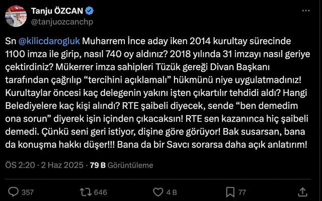 "Sayın Kılıçdaroğlu, Muharrem İnce aday iken 2014 kurultay sürecinde 1100 imza ile girip, nasıl 740 oy aldınız? 2018 yılında 31 imzayı nasıl geriye çektirdiniz? Mükerrer imza sahipleri Tüzük gereği Divan Başkanı tarafından çağrılıp “tercihini açıklamalı” hükmünü niye uygulatmadınız! Kurultaylar öncesi kaç delegenin yakını işten çıkartılır tehdidi aldı? Hangi Belediyelere kaç kişi alındı? RTE şaibeli diyecek, sende “ben demedim ona sorun” diyerek işin içinden çıkacaksın! RTE sen kazanınca hiç şaibeli demedi. Çünkü seni geri istiyor, dişine göre görüyor! Bak susarsan, bana da konuşma hakkı düşer!!! Bana da bir Savcı sorarsa daha açık anlatırım!"