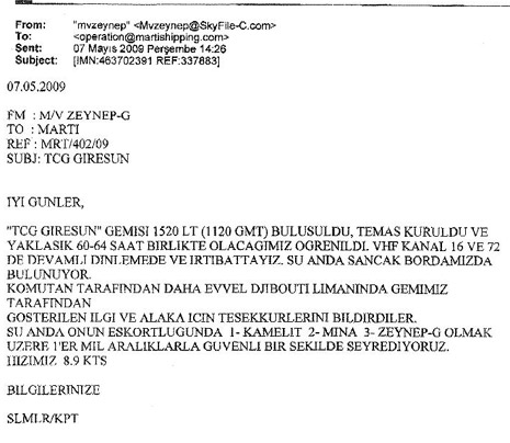 TCG Giresun gemisinin 20 saatlik bir uzaklıkta yakıt ikmali yaptıktan sonra Türk gemilerinin bulunduğu Djibouti açıklarına gelerek AKP İstanbul Milletvekili ve Milli Savunma Komisyonu Başkanı Kemal Yardımcı’ya ait KAMENIT ve yine Martı Denizcilik’e ait ZEYNEP G ve MINA isimli gemileri eksort eşliğinde bölgeden geçirdiği kaydedildi.