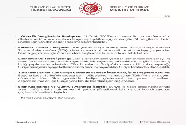 Ticaret Bakanlığından yapılan yazılı açıklamada, 8 Aralık 2024'te Suriye'de eski rejimin yıkılmasıyla halkın özgürlüğe kavuşması sürecindeki yeni dönemde iki ülke ilişkilerinde büyük ilerleme sağlandığı belirtildi. Bu kapsamda Suriye'nin en büyük ticaret ortağı olan Türkiye ile bu ülke arasındaki dış ticaret ilişkilerinde de yeni dönemin başladığı aktarılan açıklamada, "Artık Türk ürünleri sadece kuzeyde barış harekatlarımızla özgürlüğe kavuşan bölgelerde değil, bütün Suriye topraklarının ve halkının tamamına ulaşabilmektedir." ifadeleri kullanıldı.