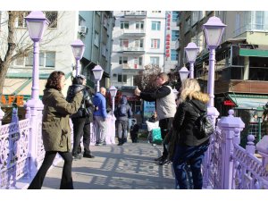 Porsuk Nehri üzerindeki köprülerde fotoğraf çektirmek isteyen turist kafilesi, Eskişehirli vatandaşlara adeta yürüyecek alan bırakmadı.