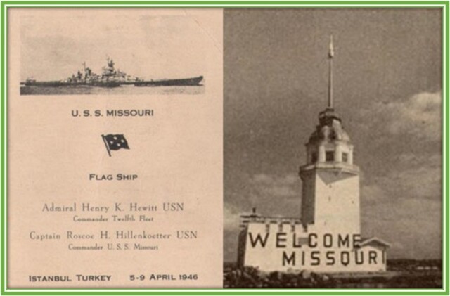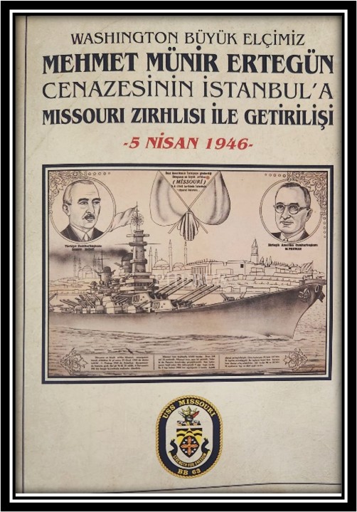 Missouri zırhlısının İstanbul ziyaretine dönecek olursak, 1944 yılında vefat eden Washington, DC Büyükelçisi Münir Ertegün’ün cenazesi ABD tarafından yapılan jestle bu gemi ve yanında birkaç gemiden oluşan filoyla Türkiye’ye getirildi. Bu gemi donanmanın en büyüğüydü, Pasifik Savaşları’nda kullanılmıştı ve Japonların teslimiyeti bu gemideki anlaşmayla sağlanmıştı. Bu önemli geminin Türkiye’ye gelmesiyle birlikte Türk-Amerikan ilişkileri de başlatılmış oldu.