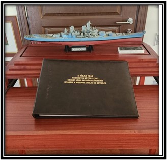 Hikayemiz, değerli dostum Bülent Yanaşık ’ın 5 Nisan 1946 yılında Amerika büyükelçimiz Mehmet Minür Ertegün’ün cenazesini getiren Missouri zırhlısının bu ziyaretinde çekilen orijinal fotoğrafları getirmesi ile başladı. Hemen resimler için albüm hazırlığına başladık ama hikâyenin tamamlanması ve sunulması içinde Missouri’nin birde maketine ihtiyacımız vardı. Bülent Yanaşık onu da bulunca artık müzemiz için sadece yerleştirmek kaldı. Bu hikâyeyi, sizlerle paylaşmak için bugünü seçerek anlamlı hale getirmek istedik. Müzemizi ziyaret ederek bu anlamlı gezinin orijinal fotoğraflarını, maketini, ziyaret ile ilgili kitapçığımızı ve 1986 yılında yeniden devreye alınması plaketi ile birlikte görebileceksiniz.