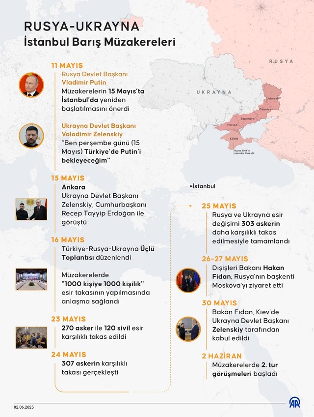Şubat 2022'de başlayan kanlı savaşın hemen ardından, Rusya ile Ukrayna'yı aynı yıl içinde hem Antalya hem de İstanbul'da aynı masada bir araya getiren Türkiye, Mayıs 2025'te de yine İstanbul'da Rus ve Ukraynalı heyetleri 3 yılın ardından aynı masaya oturtmayı başarmıştı. Rusya ile Ukrayna arasında İstanbul'daki Cumhurbaşkanlığı Dolmabahçe Çalışma Ofisi'nde 16 Mayıs'ta müzakereler yapılmıştı. İki taraf, müzakerelerde "1000 kişiye 1000 kişilik" büyük bir esir takasının gerçekleştirilmesi, olası ateşkese yönelik görüşlerin ayrıntılı sunulması, ardından da müzakerelerin sürdürülmesi konusunda mutabık kalmıştı. İki ülke, İstanbul'da anlaşmaya varılan esir takasının 25 Mayıs'ta tamamlandığını duyurmuştu.