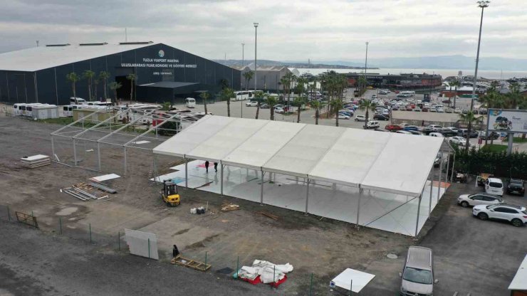 Çevre, Şehircilik ve İklim Değişikliği Bakanlığı, TOKİ eliyle hayata geçirilen ve 6 Şubat Kahramanmaraş merkezli depremler nedeniyle ara verilen Cumhuriyet tarihinin en büyük sosyal konut hamlesi "İlk Evim" projesinde kura çekimleri İstanbul ile sona eriyor. 250 bin sosyal konutun kurası 81 ilde 3,5 ay gibi kısa bir sürede tamamlandı. İstanbul için 50 bin sosyal konutun kurası Tuzla, Çatalca, Selimpaşa, Arnavutköy, Başakşehir, Esenler ilçelerinde 16 Mart- 19 Nisan tarihleri arasında noter huzurunda çekilecek. İlk Evim Projesi çerçevesinde Tuzla'ya yapılacak 20 bin 920 konutun kura çekilişine Tuzla Belediyesi ev sahipliği yapacak. Çekilişin yapılacağı iki adet çadır, Tuzla Belediyesi ekipleri tarafından Tuzla Marina'ya kurulmaya başlandı. Kura çekilişinin yapılacağı çadır havadan görüntülendi.