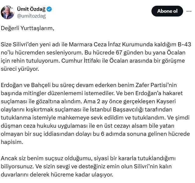 Size Silivri’den yeni adı ile Marmara Ceza İnfaz Kurumunda kaldığım B-43 no’lu hücremden sesleniyorum. Bu hücrede 67 günden bu yana Öcalan için rehin tutuluyorum. Cumhur İttifakı ile Öcalan arasında bir görüşme süreci yürüyor.