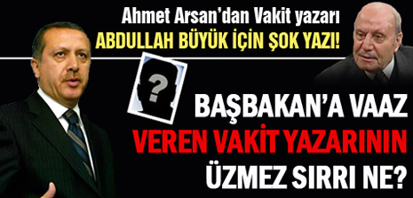 Vakit gazetesinde yazan, “küçük bir cemaat”in lideri Abdullah Büyük adlı zat, geçenlerde yazdığı bir yazıda Başbakan Erdoğan’a vaaz ü nasihatte bulunuyor.