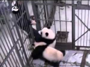 Çin'de bir hayvanat bhçesinde sevimli panda, kafese girmek istemeyince bakıcısının bacağına sarıldı ve bir süre mücadele etti. Kafese girmemek için büyük çaba harcayan panda sonunda pes etti ve bakıcısının bacağını bıraktı.