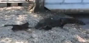 Gözü kara, kara kedi timsahlara dersini verdi! Louisiana?daki bir çiftlikte çekilen görüntülerde kara kedi, iki devasa timsaha önüne çıkıp meydan okuyor, ardından onları ürkütüp gerisin geri göle dönmeye mecbur bırakıyor.